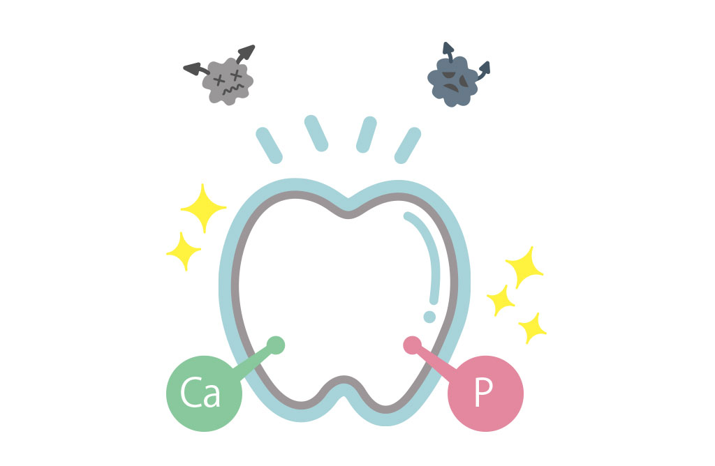 フッ素は、食べ物や飲み物にも含まれているとても安全性の高い物質で、「歯の再石灰化(酸で溶けた歯を再生する力)を促す」「むし歯菌を抑制する」「歯質を強くする」効果があります。