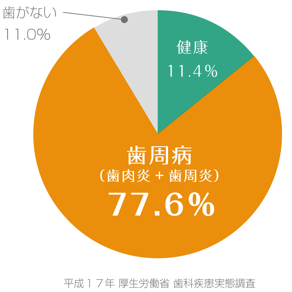 感染症の一種である歯周病は、症状に程度の差はありますが、日本の成人の80%が発症していると言われています。
